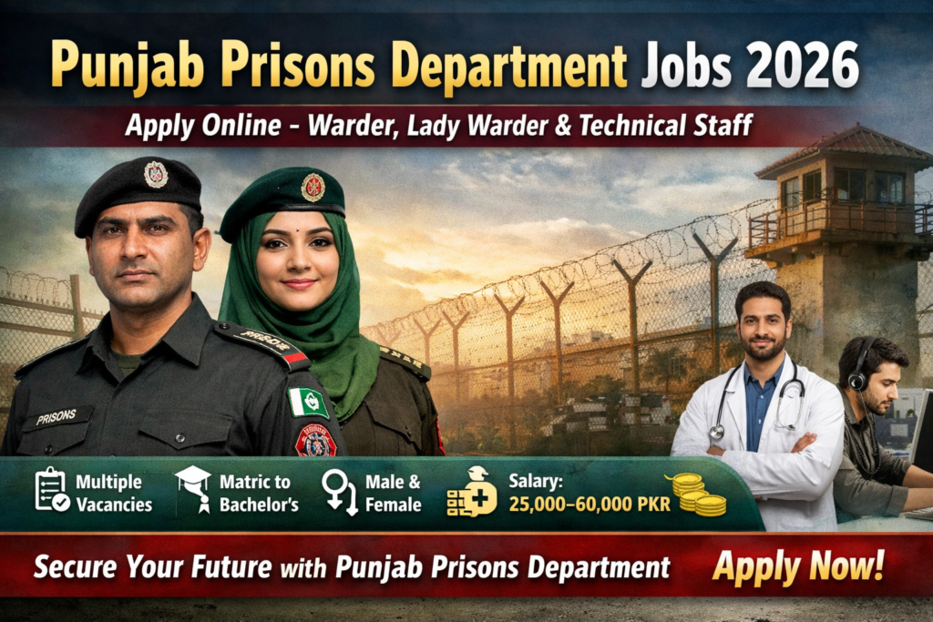 Punjab Prisons Department Jobs 2026 have been officially announced for multiple positions across various jails in Punjab, offering a golden opportunity for candidates seeking a secure and respectable government career. These latest Punjab Prisons Department Jobs 2026 are ideal for motivated, disciplined, and physically fit individuals who want to serve in the law enforcement and correctional sector of Pakistan. The department is inviting applications for Warder, Lady Warder, Data Entry Operator, Junior Clerk, Medical Staff, and other technical and support staff positions. Candidates from all districts of Punjab holding relevant educational qualifications can apply according to their eligibility criteria.